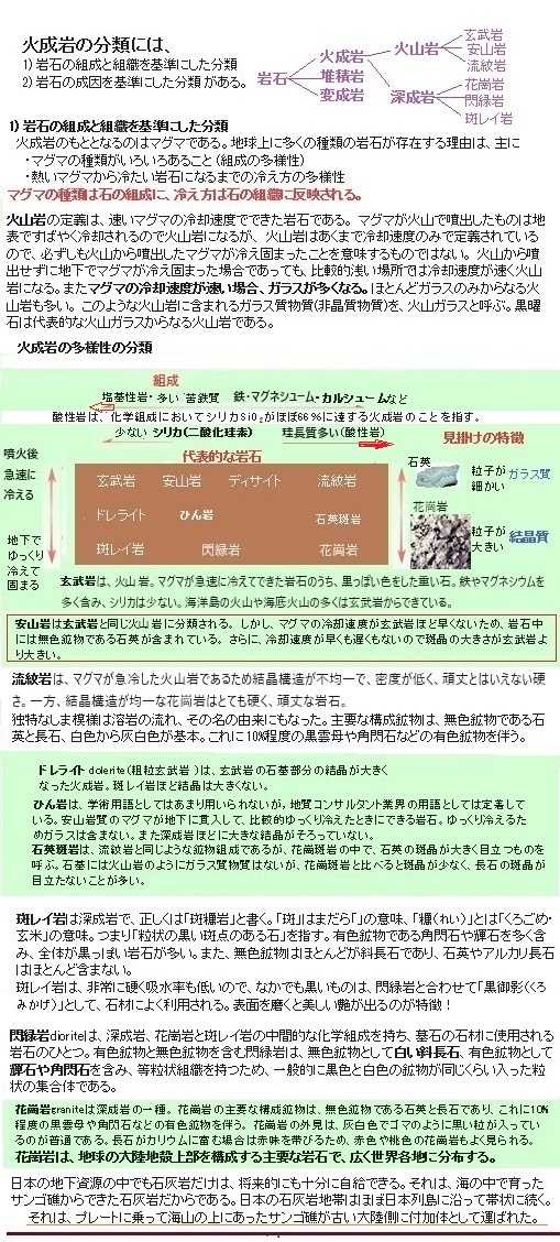 周辺は里山的な環境で、登山道や林道からその地形を観察することができる。屏風岩火山体は現在、火山活動を終えた休止火山(または死火山)として静かに存在しており、地形的・地質的な遺構として残されている。屏風岩火山体は活火山には分類されておらず、気象庁や日本気象協会の火山監視対象には含まれていない。地質学的価値 • 地質学的には、南八ヶ岳の古期火山活動(約90万〜85万年前)を示す重要な証拠であり、安山岩〜デイサイト質の溶岩が保存されている。地層の観察や岩石の分析を通じて、マグマの進化や地殻運動の履歴を読み解くことができる。 屏風岩火山体は、中期〜後期活動(チバニアン期の約50万年前〜更新世後期の10万年前)における南八ヶ岳地域での活動が中心で、この時期に形成された火山群が、現在の八ヶ岳連峰の骨格をなす。火山体は北-南方向に配列し、冷山や赤岳などがこの時期に形成されたと考えられている。 最近の活動では、約800年前の鎌倉時代、小規模な噴火が記録されており、八ヶ岳の一部は現在も活火山として監視対象になっている。八ヶ岳連峰の中部、赤岳の北に隣接する南横岳(標高2830m)は、気象庁による活火山リストに掲載され、現在は静穏ですが、過去1万年以内に噴火した記録があるとされ、活火山として分類されている。地震計や傾斜計などの観測機器が設置され、火山活動の兆候を常時監視されている。 気象庁活火山の定義は、「概ね過去1万年以内に噴火した火山」または 「現在活発な噴気活動がある火山」が対象で、赤岳・硫黄岳・阿弥陀岳なども八ヶ岳火山群に含まれるが、現時点では活火山としての監視対象にはなっていない。ただし、地質学的には更新世以降の火山活動が確認されており、潜在的な活動性を持つ山でもある。 ただ、縄文時代以降は比較的静穏な状態が続いており、黒曜石文化が花開いた背景にもなっている。 八ヶ岳火山群は、フォッサマグナの中央部に位置し、プレート境界の複雑な構造の上に形成されている。 (ソレアイトtholeiiteとは、玄武岩の一種で、ドイツのナーエ地方にある「ソレイTholey」という地名に由来する。ソレアイト玄武岩は、上部マントルの部分溶融度が高い場合に形成されるタイプであるため、マグマの分化に伴ってFeOが増加し、SiO2【45〜52 wt%】やアルカリ成分【Na2O + K2O】が少ないのが特徴、この少ないSiO2含有量が、玄武岩を塩基性mafic岩石に分類される根拠となる。ソレアイト玄武岩tholeiitic basaltは、海洋底や洪水玄武岩、flood basalt【インドのデカン高原・白亜紀末〜暁新世・約50万 km²】などに広く分布する。 デカン高原は、デカン・トラップと呼ばれる巨大な玄武岩台地によって形成されている。この玄武岩は、約6700万年前から6500万年前の白亜紀末期に起きた大規模なマグマ噴出によって形成された。この時期は、恐竜が絶滅した時期と重なる。デカン高原には、花崗岩も含まれるが、粘性が低く流動性が高い玄武岩はインド洋にあったとされるホットスポットから噴出したもの、現在は、その玄武岩が風化してできた粘土質で保湿性の高い肥沃な黒色の土壌(レグール)に変化し、綿花(綿毛)の生産量はインドと中国が非常に多く、米国やパキスタンが続く。 主に海洋底や海嶺で生成され、 中央海嶺玄武岩Mid-Ocean Ridge Basalt【MORB】とも呼ばれる。 【洪水玄武岩】は、非常に大量の玄武岩質溶岩が短期間に地表へ噴出し、その流動性により広域な台地を形成する火山現象を指す。) 目次へ |