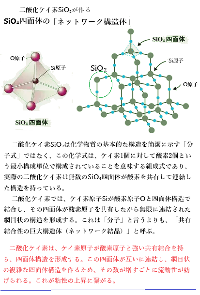 4)冷山に多く見られる黒曜石 冷山に多く見られる黒曜石Obsidianは、ソレアイト系列の玄武岩とは直接的な関係はないが、火山活動の連続性という点では深く結びついている。黒曜石は、流紋岩質マグマの急冷により、SiO2が70%以上と非常に高い非晶質つまりガラス質で、通常、黒色でガラス光沢がある。冷山の初期活動の約100万年前では、ソレアイト系列の玄武岩が噴出していた。この深部起源のマグマは粘性が低いため流動性が高い、八ヶ岳火山群の始まりを告げる岩石であった。 一方、黒曜石は後期の粘性が強く流動性が低い流紋岩質マグマが急冷してできた天然ガラスで、冷山周辺には大型バスほどの巨大露頭が存在するほど豊富にある。つまり、冷山の火山活動は、初期の玄武岩質(ソレアイト)から後期の流紋岩質(黒曜石)へと進化したと考えられる。 その化学組成は、約70〜80%と二酸化珪素SiO2が高い、その上、流紋岩質系の高いSiO2含有量がガラス化を促進し、しかも約10〜15%を含む酸化アルミニウムAl2O3が、構造安定性に寄与している。酸化アルミニウムAl2O3を含む岩石の構造は、酸化物の中ではイオン結晶を形成し、アルミニウムイオンAl3+と酸化物イオンO2-が規則正しく配列した構造を持ち、酸素原子が緻密に配列された中にアルミニウムが八面体配位で収まることで、非常に安定した三次元ネットワークを完成する。また、Al2O3はモース硬度9を持ち、ダイヤモンドに次ぐ硬さになる。しかも、Al2O3の融点は約2072℃と非常に高く、地殻深部や変成作用のような高温・高圧や化学的環境下でも、安定した結晶構造を維持できる。これにより、摩耗や破砕に強くなり、構造的な耐久性が向上し、長期的に安定した結晶構造を保つ。 黒曜石の実体は火山ガラスであり、高いSiO2含有量の流紋岩質マグマが急冷されて形成される天然の非晶質岩石で、その高いSiO2含有量がガラス質を形成する。その化学組成には以下のような成分が含まれる。 二酸化珪素SiO2が約70〜80%、酸化アルミニウムAl2O3が約10%強、その他は酸化ナトリウム、酸化カリウム、酸化鉄、酸化カルシウムなどが含まれる。