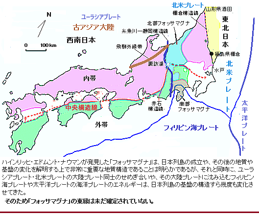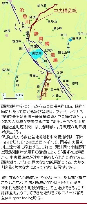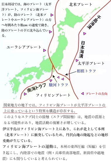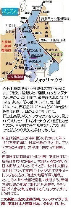 フィリピン海プレートに乗って北上してきた伊豆半島は、現在本州に衝突しており、これはフォッサマグナ南部の地質構造に大きな影響を与えている。伊豆半島は本州で唯一フィリピン海プレート上に位置しており、南からの「くさび」として日本列島に打ち込まれている。 南アルプス・丹沢山地の隆起 伊豆半島の衝突により、南アルプスや丹沢山地が隆起しており、これはフォッサマグナの西縁・東縁における地殻変動の一因になっている。伊豆諸島から富士山に至る火山フロントは、フィリピン海プレートの北上に伴う沈み込み帯の活動によって形成されており、フォッサマグナの中央部に火山活動の痕跡を残している。 プレートが本州に衝突し続けていることにより、特に伊豆半島は火山活動によって地殻が軽くなっているため、沈み込まずに本州を強く押している。その結果、丹沢山地や富士川沿いの地層が激しく褶曲し、富士山の成長や地殻変動にも影響を与えている。 御坂山地とフィリピン海プレートの関係 御坂山地もまた、フィリピン海プレートの北西進行による地殻変動の影響を受けている地域で、特に、南部フォッサマグナの形成過程において重要な役割を果たしている。 御坂山地は山梨県の甲府盆地の北西に位置し、南部フォッサマグナの北縁に当たる。この地域は、伊豆・小笠原弧が本州に衝突してきた過程で形成されたと考えられている。 地質学的には、御坂山地は第四紀更新世後期の早い段階、約12〜10万年前頃に隆起したとされ、これは伊豆・小笠原弧の衝突によって丹沢山地や伊豆半島が形成されるよりもやや先行していると言う。 地震波トモグラフィや反射法地震探査によると、御坂山地の地下にはフィリピン海プレートのスラブが北西に傾斜して沈み込んでいる構造が確認されており、現在も地殻の変形や断層活動に影響を与えている。 GPS観測などから、御坂山地周辺も年間数cmの速度で北西方向に移動しており、これはフィリピン海プレートの運動による東西圧縮応力の伝播によるものと言う。 ![]() 関東南西部では、地層の歪みや川の流路が、フィリピン海プレートの北上とプレート境界の変遷によるものであることが示唆されている。これはフォッサマグナの地質的影響力の複雑性を示している。 諏訪湖の形成 諏訪湖の形成年代は、地質学的には完新世直前の約1万8千年前以降に現在の湖として形成されたと考えられている。ただし、その背景にはさらに古い地殻変動が関与しており、複数の段階を経て現在の姿に至っている。 新生代新第三紀鮮新世終期の約260万年前、フォッサマグナの西縁に位置する断層帯の活動により糸魚川-静岡構造線の断層活動により地殻が引き裂かれ、構造湖(断層湖)の原型が誕生した。 約1万8千年前以降、最終氷期末期から間氷期にかけて、降水量の増加と地殻変動による地形の沈降が起こり、天竜川流域では水の滞留が生じた。それにより天竜川の塚間川扇状地の形成が、流れをせき止め、現在の諏訪湖が形成されたと言われている。 塚間川扇状地は現在でも地形として確認可能で、それは天竜川下流域に広がる扇状地の一部として、地質学的・地形学的に記録されており、特に浜松市や磐田市周辺の地形にその痕跡が残っている。その地下には「三方が原礫層」などの堆積物が広く分布し、これが更新世終期に属する扇状地堆積物である。 古墳~平安時代、諏訪湖の湖面が最大化し、その後、土砂堆積や護岸工事による人為的変化により縮小した。 フィリピン海プレートの北上は、伊豆半島の衝突を通じてフォッサマグナの南部に強い圧力をかけている。諏訪湖はフォッサマグナの北部に位置するが、このプレート運動による断層の再活動や地殻の歪みが、湖の形成と維持に間接的に影響を与えていると考えられている。 諏訪湖の形成は、フォッサマグナの地質構造と、北上するフィリピン海プレートの力学的影響が交差する地点に位置しており、加えて、フォッサマグナ西縁の糸魚川-静岡構造線と、中央構造線という日本列島を代表する2大断層が交差する地点に諏訪湖は存在する。 この交差点では、横ずれ断層が雁行状(がんこうじょう)に並び、断層間の引張力によって地殻が陥没し、プルアパート盆地(引き裂かれた盆地)が形成された。諏訪盆地はその典型例であり、諏訪湖はその中心に位置する。 フィリピン海プレートは、伊豆・小笠原弧を乗せて新生代古第三紀暁新世の約1500万年前から現在に至るまで北上し続けており、本州中央部に衝突している。 この衝突によって、南部フォッサマグナでは地殻が圧縮され、丹沢山地や伊豆半島の隆起は未だ進行中である。 諏訪湖は北部フォッサマグナに位置するが、その地層も厚く、南部の衝突の影響が間接的に波及している。 糸魚川-静岡構造線は、その南部ではプレート境界としての性質を持ち、北部ではリフト境界としての性質を持つため、諏訪湖付近では両者が連結され、横ずれ断層帯として活動し続