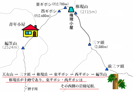 権現岳周辺の地形は、南八ヶ岳の中でも特に複合した美しい稜線構造を築き上げた。三ツ頭・権現岳・東ギボシ・西ギボシは、それぞれが連続した尾根上に位置するピークであり、この4つのピークは、南八ヶ岳の主稜線上に東西方向に並ぶ。 三ツ頭(2580m)は権現岳の東側に位置する前衛峰であり、天女山方面からの登山ルートの最初のピークで、なだらかな草地と展望が広がり、権現岳の岩稜を望む絶好の場所でもある。その岩石組成は、安山岩・火山角礫岩・火山灰、地質年代は更新世中期(約50万〜30万年前)、権現岳の火山活動の副次的な地形として形成されたと考えられている。権現岳の噴火によって噴出した安山岩質の溶岩流や火砕物が、東側に広がり、三ツ頭の基盤を構成した。火口から離れた位置にあるため、比較的穏やかな地形が形成された。 噴火後、数十万年にわたる風化・浸食作用によって、三ツ頭は権現岳の主峰から独立したピークとして分化した。 特に、氷期の凍結融解作用や豪雨による開析が、尾根と谷を明瞭に分けた。 地形的には、八ヶ岳地域は、糸魚川–静岡構造線に近い地殻変動帯にあたり、プレート境界の応力が、三ツ頭の稜線を、東西圧縮応力による隆起と断層活動によって、火山麓扇状地の上端部に岩稜丘を発達させた。この活動により、擬宝珠(ぎぼし)を三つの峰とする新しい火山体を形成した。稜線上のピークが、擬宝珠のように丸く盛り上がった三つの峰を持つことから、三ツ頭(みつがしら)と呼ばれるようになった。 権現岳は東西にピークを持つ双耳峰で、東峰(2,715m)が権現岳、西峰(2,700m)が擬宝珠(東ギボシ)と呼ばれている。もう一つの権現岳の西峰に連なる岩峰が、西ギボシ(2,680m)で、南八ヶ岳の稜線構造の中で地形的・登山的・地質的に重要な位置づけを持っている。編笠山方面へ向かう縦走路上にあり、青年小屋との間に位置する。地形的には岩稜帯の末端部であるが、権現岳の双耳峰構造の一翼を担う。権現岳から編笠山へ向かう際の通過点として、 東ギボシのトラバース(鎖場)と比べて、比較的穏やかな地形で、登山者の緊張が緩む区間、青年小屋との接続点として、休憩・ルート分岐の目安にもなる。地図や文献によっては「西峰=東ギボシ+西ギボシ」と表記されることもある。西ギボシは単独峰というよりも、権現岳の尾根構造の一部としての位置づけが強い。東ギボシ・西ギボシはその西側の岩稜尾根であり、すべてが火山活動と浸食によって形成された連続地形であり、地質的にも連関している。三ツ頭は、権現岳の東側に連なる三つの小ピークで、地形的には溶岩円頂丘lava domeの一部とみなされているが、地質調査では、三ツ頭周辺に明瞭なカルデラや火口縁構造は確認されていない。また、それぞれのピークが独立した火口を持つわけではない。 火口は権現岳本体に関連する可能性が高いが、権現岳自体は、古阿弥陀岳火山の山体崩壊後に形成された再生火山体の馬蹄形カルデラの縁であった。その火口活動の中心は、権現岳本体やその周辺の赤岳〜阿弥陀岳に集中していたと考えられている。三ツ頭の形成は、火山活動の末期における粘性の高い溶岩の押し出しによるものと推定されている。そのため、火口というよりは、マグマの噴出によって盛り上がった地形となった。権現岳では山体崩壊も起こり、火砕流や爆発的噴火も加わり、馬蹄形カルデラの形成などもあり地形的に複雑である。 これが神聖な山容として信仰を集める要因となった。山頂の鉄鉾(てっぽう)や祠は、神仏の降臨を象徴する装置として設置された。 権現岳は、古火山の残骸の上に再びマグマが噴出してできた溶岩円頂丘lava domeと考えられている。権現岳の馬蹄形火口は、阿弥陀岳・赤岳・編笠山を含む南八ヶ岳の火山群にまたがって形成されたものではない。それは権現岳周辺に局所的に形成された地形であり、編笠山や赤岳・阿弥陀岳とは火山体も形成時期も異なっている。 南八ヶ岳の火山群は、複数の火山体が時期をずらして形成された複合火山系であり、 編笠山は約100万年前の活動 、.権現岳・三ツ頭は約50〜30万年前の活動、 赤岳・阿弥陀岳は比較的若く、約20万年前以降の活動と言う。赤岳や阿弥陀岳との間には、キレット(急峻な尾根と谷)があり、地形的にも火口構造が連続していない。 「キレット」は漢字で「切戸」と書き、山稜上にある急峻で深く切れ落ちた鞍部(あんぶ)、つまり尾根のくびれた部分や切れ込みを指す登山用語で、日本アルプスなどの高山帯でよく使われる言葉で、特に岩稜帯の難所として知られることが多い。 チバニアン期の約15万〜更新世後期の3万年前、穏やかな活動により北八ヶ岳全体にわたる現在の山容が完成した。この時期の活動は、爆発的な噴火ではなく、粘性の高い溶岩の押し出しにより穏やかな森と池沼の地形が広がった。切り立った岩稜が連なる南八ヶ岳でも、この時期、粘性の高い溶岩がゆっくり噴出し、編笠山や美濃戸中山(2386m)などの